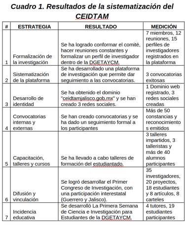 Resultados y discusión. Este proyecto del CEIDTAM ha logrado resultados significativos gracias a la ayuda de la implementación de la plataforma digital, la cual ha permitido la sistematización de los procesos (Da Silva, Felipe; Núñez, Georgina, 2021). Los resultados generales en los que ha coadyuvado se pueden presentar, según cada una de las estrategias planteadas dentro del plan indicativo del CEIDTAM: