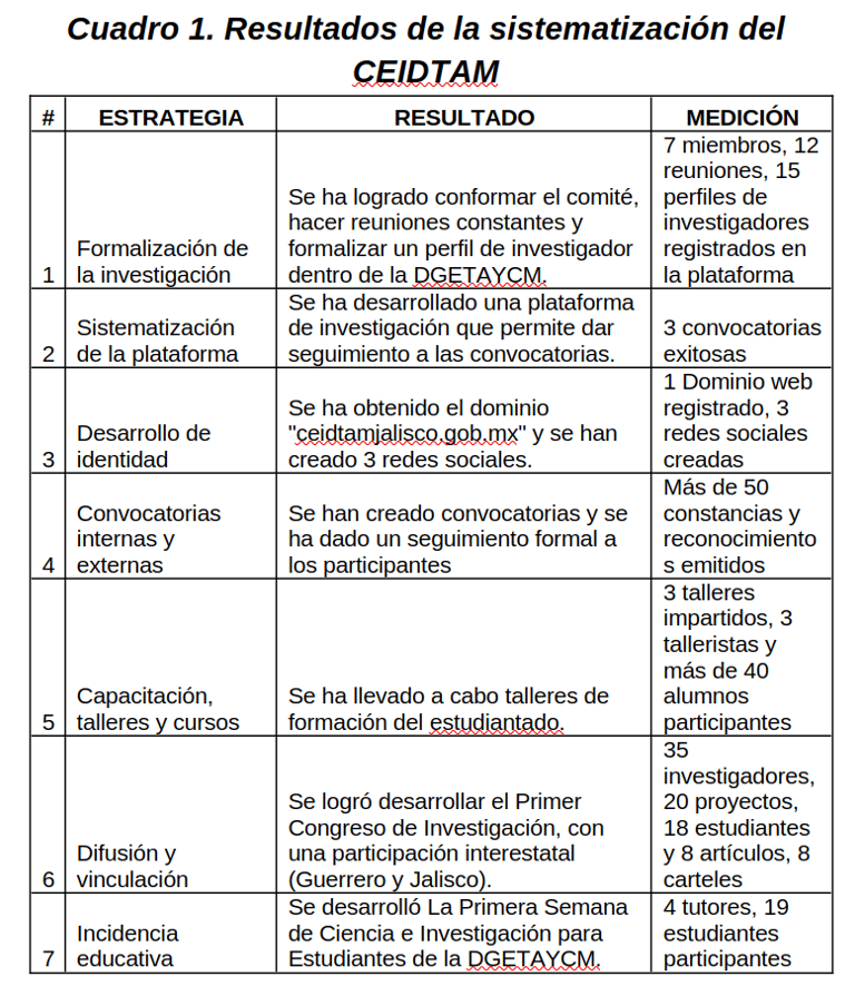 El proyecto de la plataforma digital para sistematización de procesos del CEIDTAM ha tenido un impacto positivo en el desarrollo de la investigación científica en el estado de Jalisco. En particular, el proyecto ha coadyuvado a la formalización de la actividad de investigación, a la sistematización de los procesos de investigación, a la mejora del seguimiento de las convocatorias, al fortalecimiento de las capacidades de los investigadores y a promover la difusión de los resultados de investigación. Sin embargo, para consolidar el Programa de Investigación Educativa, Tecnológica, Validación y Transferencia de Conocimientos en instituciones de la DGETAYCM, es necesario continuar fortaleciendo los procesos de investigación, fortaleciendo al comité, promoviendo la colaboración entre investigadores y vinculando la investigación los estudiantes y con la sociedad.