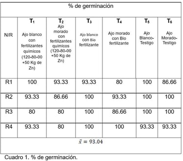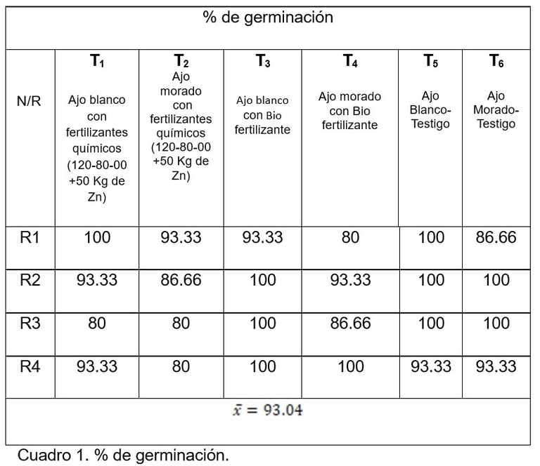 Resultados y discusión. La germinación y desarrollo del cultivo de ajo depende de varios factores. En el presente trabajo se encontró que los mayores porcentajes de germinación a los 51 días y el desarrollo se vieron influenciados de manera positiva con la aplicación de biofertilizante, encontrándose valores de 93.33, 100, 100 y 100% en el cuadro 1, respectivamente. Esta información coincide con lo argumentado por ( 1 ) En la semana 4 todos los bioles tuvieron Índices de germinación mayores al 80%, el biol proveniente del estiércol de vaca tuvo mayor contenido de nitrógeno comparado con el de los otros estiércoles, todos tuvieron similar contenido de P y K. En el cultivo de espinaca no hubo diferencia significativa en la altura de las plantas y peso de parte aérea aplicando el biol al 20 o 40%; el mayor desarrollo se encontró en las plantas donde se aplicó fertilizante químico, sin embargo, estas plantas presentaron marchitez más pronto. Con la aplicación de todos los bioles se obtuvo mayor altura y peso aéreo que las plantas donde solo se usó suelo agrícola, demostrando el potencial fertilizante de los bioles. Sin embargo, ( 3 ) menciona que El ajo es un cultivo que puede responder en forma favorable ó desfavorable a la aplicación de fertilizantes ya que es una planta muy sensible a los excesos y deficiencias de nutrientes. La cantidad adecuada de fertilizante por plicar depende de varios factores tales como: cultivo anterior, tipos de fertilizantes y cantidad aplicada y la densidad de población a utilizar de ajo. Dependiendo del tipo de suelo la fertilización nitrogenada pudiera ser de 120 hasta 240 kg de nitrógeno por hectárea. Mientras que la cantidad de fósforo pudiera ser de 60 a 80 kg por hectárea. En caso requerido y con el objetivo de suplementar zinc y calcio podrán ser contempladas aplicaciones de sulfato de zinc y superfosfato triple de calcio. Las épocas de aplicación del fertilizante en el cultivo del ajo son dos: La primera se realiza al momento de sembrar o antes del primer riego de auxilio aplicando la mitad o una tercera parte del nitrógeno, todo el fósforo y todo el zinc y la segunda aplicando el resto del nitrógeno de 50 a 60 días después de la primera aplicación.