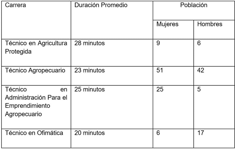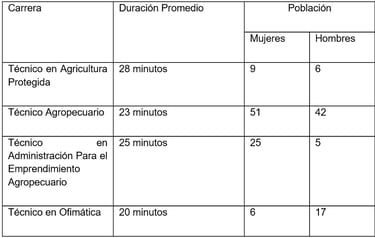Cuadro 1. Duración promedio del autoregistro por carrera técnica en la generación 2022-2025.
